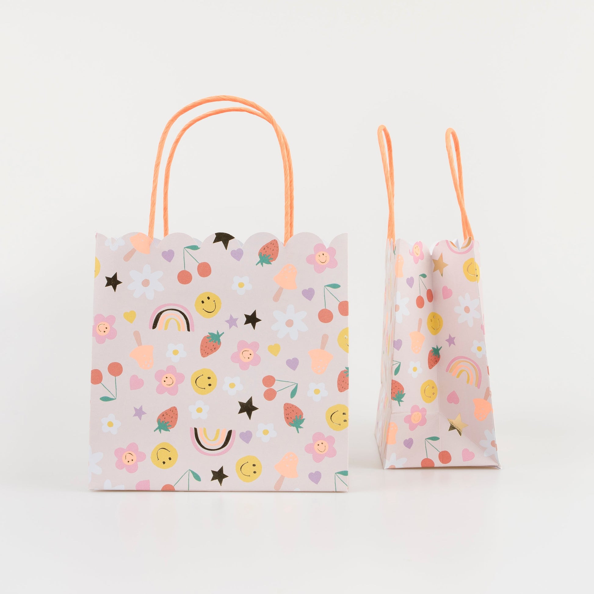 Put an even bigger smile on your guests' faces with these party bags covered in happy designs. Fabulous, fun icons with more than a whiff of 90s nostalgia – smiley faces, mushrooms, rainbows, fruit, stars, hearts and flower power!