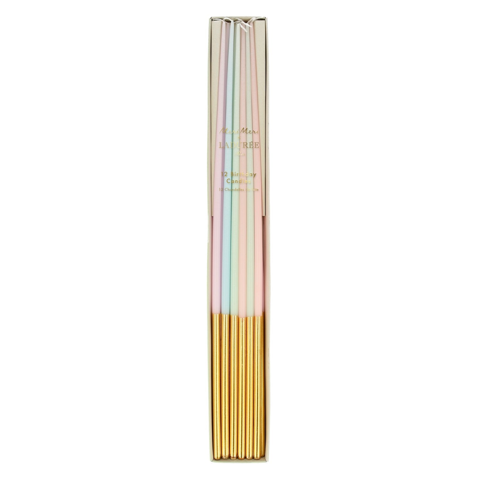Why have plain candles when you can have them in beautiful shades, with stunning gold metallic ink details? We're delighted to collaborate with Ladurée, the restaurant, tea room and macaron specialist, to create these gorgeous candles to make any celebratory cake look so stylish.
