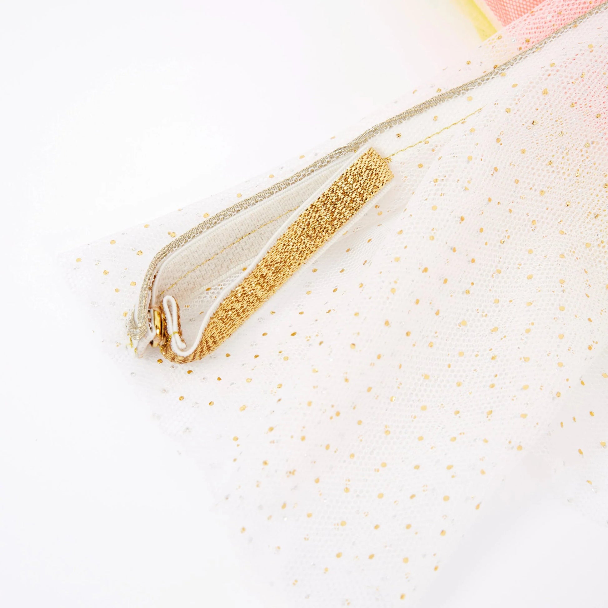 This gorgeous rainbow dress-up kit is perfect for a little one to transform into a beautiful fairy. The dress is made from layers of colorful tulle, for a spectacular effect, and has a poly-cotton lining. It has floaty layered tulle wings attached, with a glittery gold border. Comes with a wand, with a happy sun face, to cast magical spells.